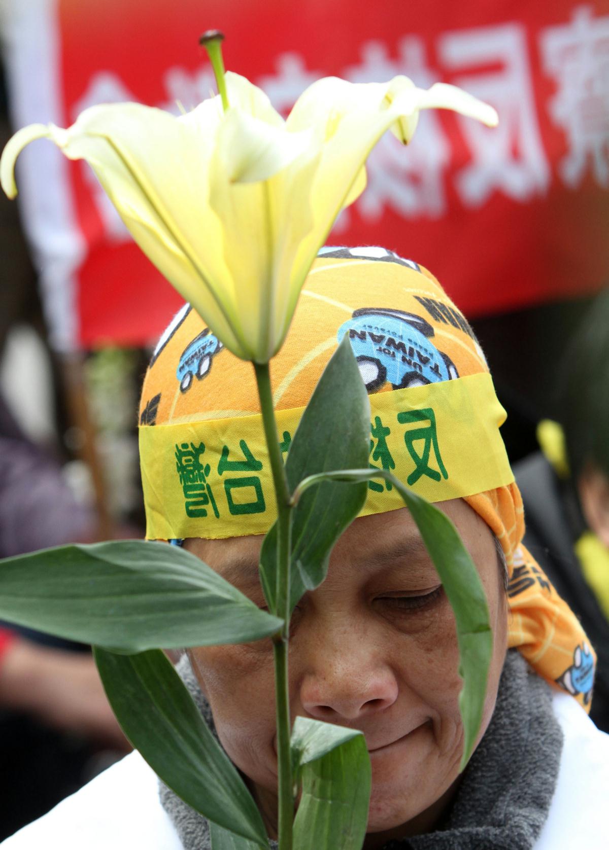 2011-03-17, Тайваний нийслэл Тайпэй хот. Цөмийн станцыг эсэргүүцсэн жагсаал. Толгойдоо зүүсэн туусан дээр "Атомыг эсрэг, Тайваныг аварья" гэжээ.
