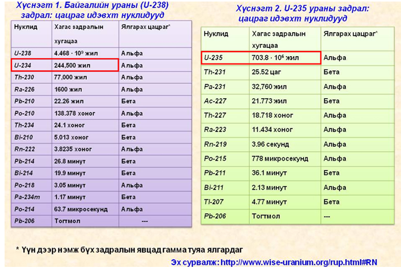 Хагас задралын хугацаа гэдэг нь цацраг идэвхит бодисын тал хувь нь задарч дуусах хугацааг хэлэх бөгөөд цөмийн түлшний дийлэнхийг бүрдүүлдэг Уран-234 изотопын хагас задралын хугацаа нь 244500 жил юм. Мөн цөмийн хаягдалд ихээр агуулагддаг Уран-235-ын хагас задралын хугацаа нь 703 сая жил ажээ (1).