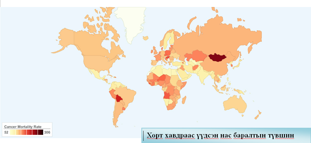 8. Дэлхийн улс орнуудын хүн амын эрүүл мэндийг үнэлсэн жагсаалт. ДЭМБ, Дэлхийн Банк, ЮНЕСКО, ХМТ-ны тоо баримтaнд суурилсан. http://www.worldlifeexpectancy.com/cause-of-death/all-cancers/by-country/