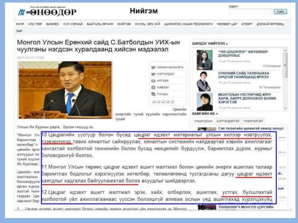 (61)     Монгол Улсын Ерөнхий сайд С.Батболдын УИХ-ын чуулганы нэгдсэн хуралдаанд хийсэн мэдээлэл. “Өнөөдөр” сонин, 2011 оны 1 сарын 21. http://www.mongolnews.mn/i/15436