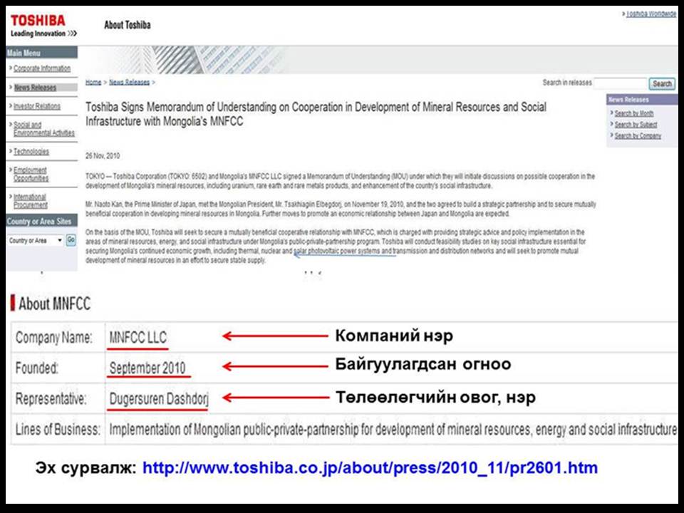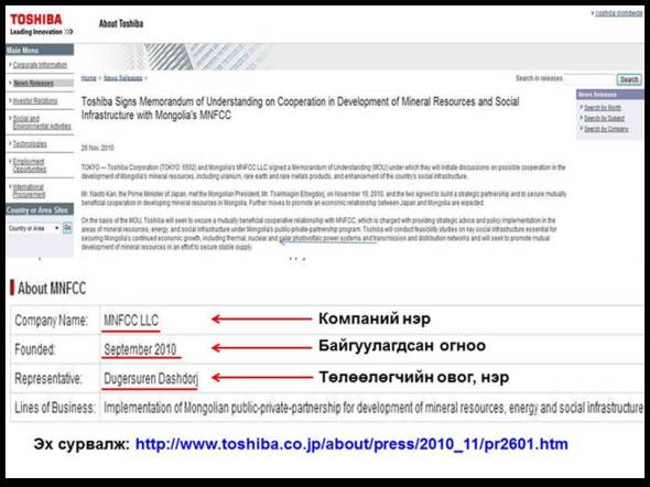 Тошиба корпорацийн вебсайт дээрх “MNFCC” компанийн тухай мэдээлэл