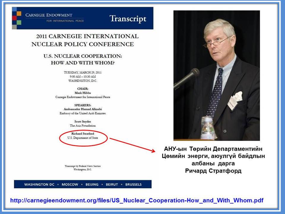 Ингэж байхад 3 сарын 31-нд АНУ-ын Цөмийн Энергийн бодлогын нэгэн томоохон хурал дээр Эрчим хүчний албаны дарга Ричард Стратфорд гэгч Монголд олон улсын цөмийн хаягдал булшлах яриа явагдаж байгаа гэж ярьснаар (71) аалзны тор шиг хичээнгүйлэн хэрж байсан байсан бохир бизнес дэлхий нийтэд ил тод болов. Гэвч Монголын эрх баригчид шантарсангүй, асуудлыг үгүйсгэхийн зэрэгцээ зорьсноо биелүүлэхээр хичээсээр.