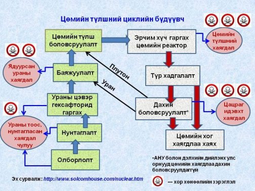 Товчхондоо бол цөмийн цикл нь уран олборлолт — баяжуулалт — цөмийн реакторын түлшний үйлдвэрлэл —- АЦС-аас гарсан цөмийн хаягдлын менежмент гэсэн үндсэн хэсгүүдтэй.  Сүүлийн үед “цөмийн хаягдал түлшийг дахин боловсруулж, шинээр түлш хийдэг” хэмээн гүтгэгчид (4олширсон ч цөмийн цикл нь хаягдалгүй, битүү цикл биш билээ. Үнэхээр тийм байсан бол ганц олборлосон уранаараа АЦС-ын түлш хийж ашиглачихаад, хаягдлыг нь ахин дахин боловсруулдаг, хаягдалгүй үйлдвэрлэл явагдах бус уу?