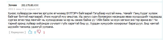Иш, Даваасэрээтэр минь, үнэхээр ойд төөрсөн сармагчин мэт болтлоо хөгжил дэвшлээс ч хоцорч, бас баруун зүүнээ олохгүй болтлоо төөрчээ чи. 1рт, энэ бол үнэгүй сайт (wordpress блог) болохоор санхүүжүүлэх шаардалага байхгүй. 2-рт, тэр Жаргалсайхан гэдэг чинь чиний өмөөрөөд байгаа мөнгө луйвардаж Шүүхээр олон удаа орсон Цөмийн Энергийн Газрын дарга H. Тэгшбаярын хэвлэл мэдээллийн ажилтан ш дээ. Цөмийн эрчим хүч, цөмийн хаягдлыг магтан дуулах үүрэгтэй хүн тэр чинь. Юун манай блогийг санхүүжүүлэх. ККК…Ер нь сурамгай хүн хэлэмгий гэдэг, мөнгө яриад байгаагаараа өөрөө нөгөө хөлсний сэтгэгдэлчин мөн бололтой.