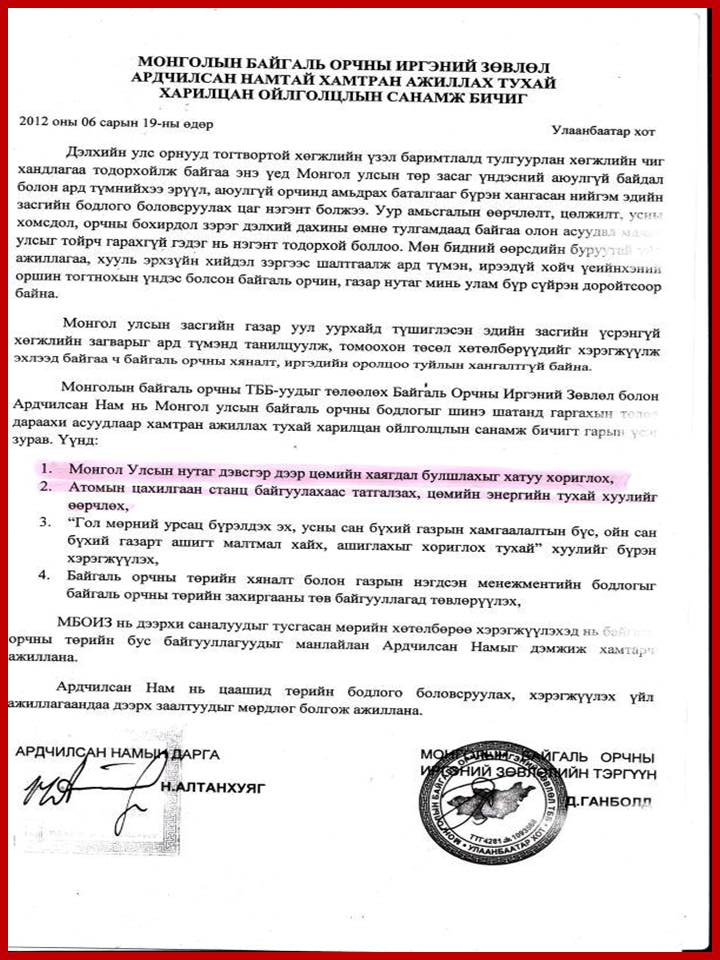 - Монгол улсын нутаг дэвсгэр дээр цөмийн хаягдал булшлахыг хатуу хориглоно гэсэн АН-аас ард түмэндээ өгсөн амлалтуудтай яв цав тохирч буйг анхаараарай.