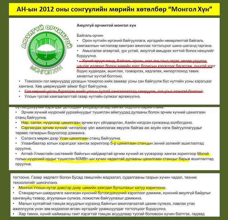 4) Байгаль орчны хяналт, менежментийн талаар яриад ч нэмэргүй биз дээ. Өчигдөрхөн буюу 10 сарын 29-нд Байгаль Орчин, Ногоон Хөгжлийн сайд, Кэмбрижийн их сургуульд эрдэс судлалаар докторын зэрэг хамгаалсан С. Оюун “Уран олборлох нь хүний эрүүл мэндэд сөрөг нөлөөгүй. Шар нунтаг ч хоргүй” гэж мэдэгдсэн нь дэлхий дахинд тэнэгээрээ гайхагдах анхны Ногоон намын дарга болов. АН-ын УИХ-ын сонгуулийн мөрийн хөтөлбөр дэх заалтууд ч гэсэн түрхэн зуур хошгируулах хуурамч амлалтууд төдий байсан нь ч илэрхий.