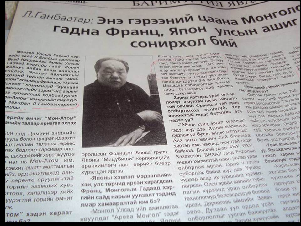 2013 оны 10 сарын 28. “Мон-Атом” компанийн дэд захирал Л. Ганбаатар гэгч “Өдрийн сонин”-д өгсөн ярилцлагандаа “Монгол улс уранаа боловсруулж гаргана, эргүүлж хаягдлыг нь авна, уран гаргасан улс орон тэгдэг журамтай” гэж ихэд мэдэмхийрэн ярьжээ.