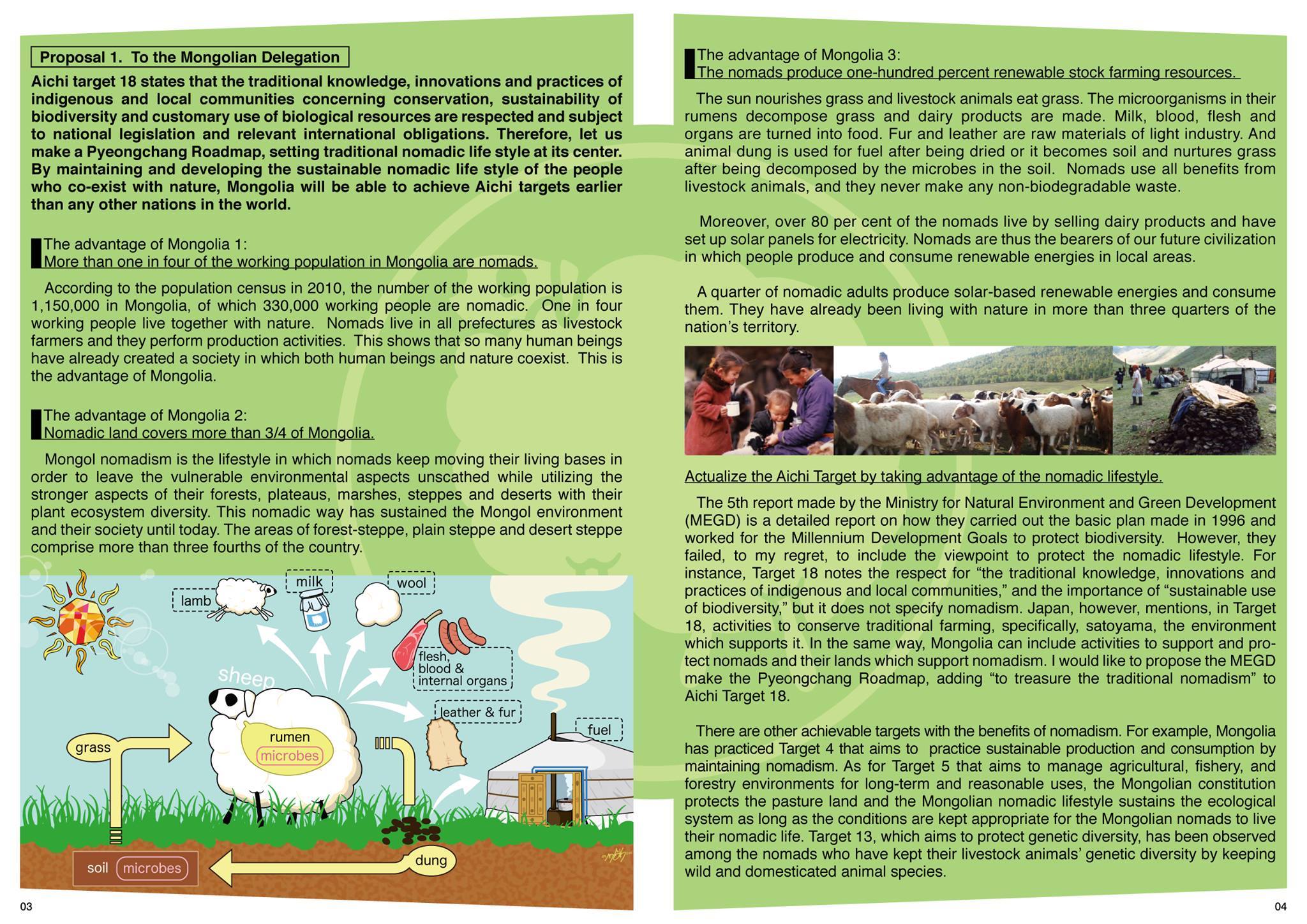 Ингээд та бүхэнд саяхан Солонгос улсын Пёнчан хотноо болсон дээр дурдсан олон улсын хурал дээр Япон улсын Осакагийн их сургуулийн хэл соёл судлалын сургуулийн дэд профессор, бэлчээрийн мал ажуйн бүс нутгийн онол судлаач Имаока Рёокогийн хэлсэн үг, БОНХЯамны үндэсний тавдугаар тайлангийн дүгнэлт, тавьсан саналыг доор толилуулья.