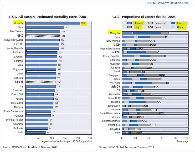 Posted: 2014/11/29 Filed under: Хүнсний аюулгүй байдал | Tags: Ноцтой Leave a commentӨнөөдөр Монгол улс хорт хавдар, нэн ялангуяа элэг, ходоод, улаан хоолой, уушигны хорт хавдарын нас баралтаар Ази тивд төдийгүй дэлхийд тэргүүлж явна. Энэ түгшүүрт мэдээг Эдийн засаг хамтын ажиллагаа, хөгжлийн байгууллагаac (OECD) Дэлхийн Эрүүл Мэндийн Байгууллагатай хамтран гаргасан “Эрүүл мэндийн тухай товч мэдээлэл: Ази, Номхон Далайн бүс 2012 он” (“Health at a Glance: Asia/Pacific 2012”) гэдэг товхимолд дурьджээ. Тоо баримтаас үзвэл, Монгол улс 100 мянган хүнд хорт хавдарын шалтгаантай 206 нас баралт ногддог үзүүлэлтээрээ 145 нас баралтаар удаахь байранд орсон Хятадаас ч тасархай түрүүлжээ.
