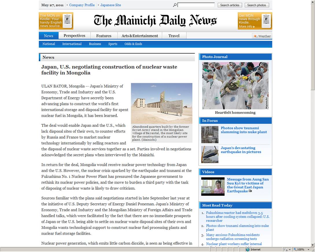 Posted: 2011/05/13 Filed under: Гадаад, дотоодын хэвлэл, Цөмийн хаягдал, цөмийн аюул, Mainichi Shimbun | Tags: Ноцтой 4 CommentsЦөмийн хаягдлыг Монголын нутагт агуулбал мөнгө өгнө гэж хэмжээг нь хүртэл хэлээд байна