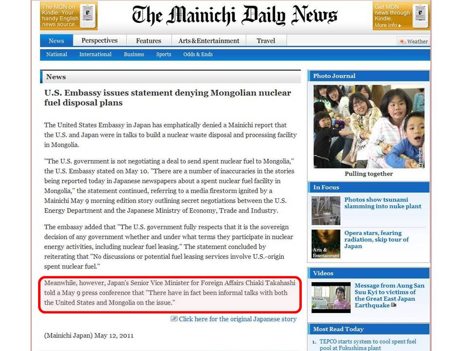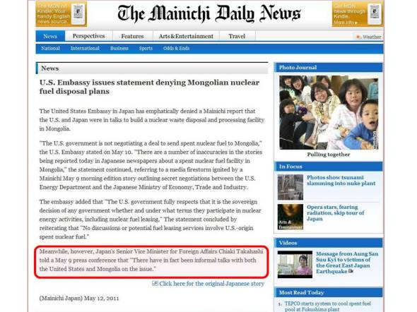 Майничи сонины 2011 оны 5 сарын 12-ны дугаарт Япон дахь Америкийн ЭСЯ-наас мэдэгдэл хийжээ. Тус мэдэгдэлд Монголд цөмийн хаягдал булах тухай АНУ болон Японы талууд нууцаар хэлэлцсэн гэдгийг үгүйсгээд, цөмийн түлш үйлдвэрлэж түрээслэх, цөмийн эрчим хүч үйлдвэрлэх үйл ажиллагаа явуулах эсэх, ингэхдээ ямар нөхцөл болзол тавих зэрэг асуудлыг аливаа улс орон бие даан шийдэх эрхтэй бөгөөд тэр эрхийг нь АНУ хүндэтгэж үздэг гэж тэмдэглэжээ.